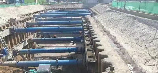 该工程于今年5月中旬开始施工,项目部提前编制了专项施工方案,并经过专家论证。5月25日基坑开挖,项目部弘扬工匠精神,基坑围护根据方案及现场环境采用拉森钢板桩支护,转角部位水泥桩加固支护。开挖土方至1.5米,设置第一道支撑,采用直径609毫米×14毫米钢管作为对撑或斜撑。开挖至坑底,垫层施工、支护桩之间设置第二道支撑,坡顶采用钢筋网固定,喷射细石混凝土。基坑边砌筑挡水墙,设置排水沟。指定第三方检测单位进行每日变形监测。
